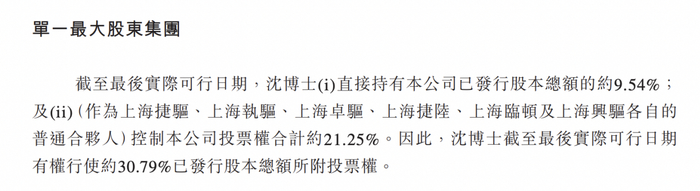 IPO前,沈捷直接持有公司已发行股本总额的约9.54%;及(作为上海捷驱、上海执驱、上海卓驱、上海捷陆、上海临顿及上海兴驱各自的普通合伙人)控制公司投票权合计约21.25%。因此,沈捷有权行使约30.79%已发行股本总额所附投票权。