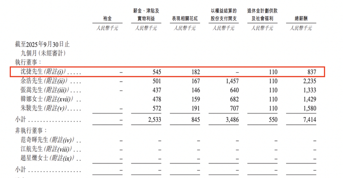 薪酬方面,2023年、2024年及2025年前9月,沈捷总薪酬分别为111.6万元、111.3万元及83.7万元。