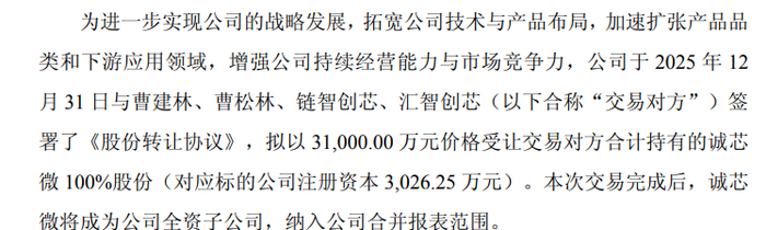 公告显示,希荻微电子集团股份有限公司宣布以现金方式收购深圳市诚芯微科技股份有限公司100%股份。希荻微为实现战略发展,拓宽技术与产品布局等,于2025年12月31日与曹建林、曹松林、深圳市链智创芯管理咨询合伙企业(有限合伙)、深圳市汇智创芯管理咨询合伙企业(有限合伙)签署《股份转让协议》,拟3.1亿元受让诚芯微100%股份,对应注册资本3026.25万元。
