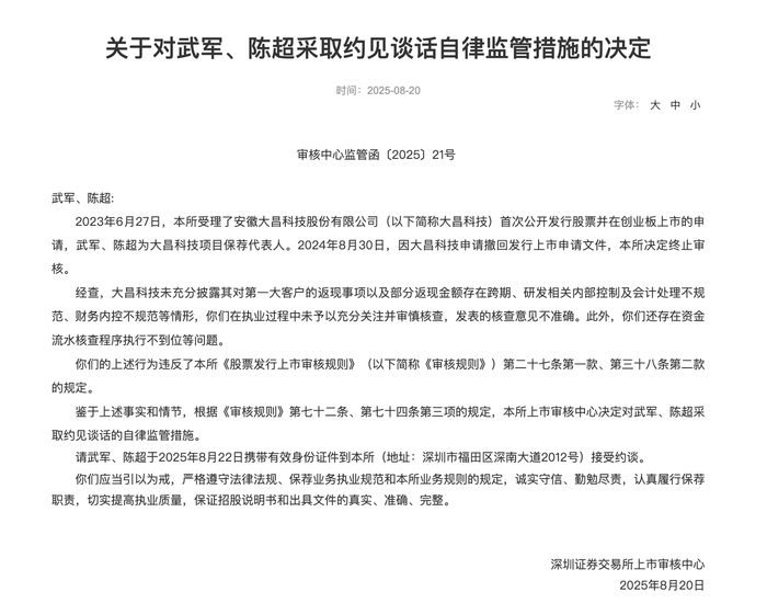 值得注意的是,2025年8月,深交所对项目保荐代表人武军、陈超采取了约见谈话监管措施。经查,大昌科技未充分披露其对第一大客户的返现事项以及部分返现金额存在跨期、研发相关内部控制及会计处理不规范、财务内控不规范等情形。武军、陈超在执业过程中未予以充分关注并审慎核查,发表的核查意见不准确。此外,他们还存在资金流水核查程序执行不到位等问题。