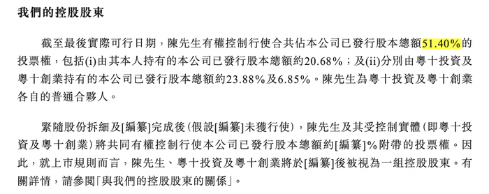 IPO前,陈彬彬有权控制行使合共占公司已发行股本总额51.40%的投票权,包括由其本人持有的公司已发行股本总额约20.68%;及分别由粤十投资及粤十创业持有的公司已发行股本总额约23.88%及6.85%。陈彬彬为粤十投资及粤十创业各自的普通合伙人。