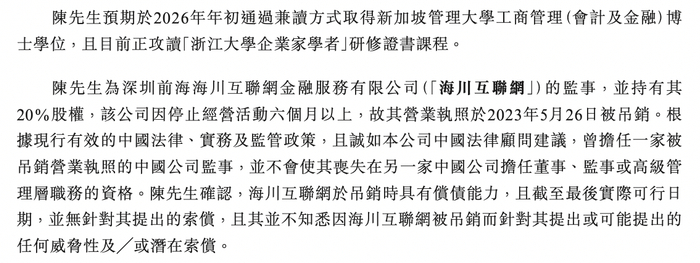 陈彬彬预期于2026年年初通过兼读方式取得新加坡管理大学工商管理(会计及金融)博士学位,且目前正攻读“浙江大学企业家学者”研修证书课程。