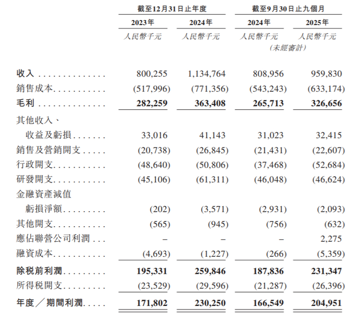 业绩方面,2023年、2024年及2025年前9个月,浙江荣泰的营业收入分别为8亿元、11.35亿元及9.60亿元;利润分别为1.72亿元、2.30亿元及2.05亿元。