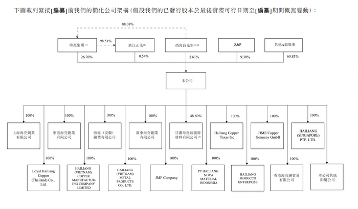 IPO前,冯海良(即公司董事长冯橹铭之父)于公司已发行股本总额约29.85%(其中包括冯海良直接持有的2.61%,海亮集团持有的26.70%,及浙江正茂持有的0.54%)中拥有权益。海亮集团及浙江正茂均由冯海良最终控制。除截至最后实际可行日期已回购并于公司股份回购账户持作库存股的8063.61万股A股外,冯海良控制公司约30.93%表决权。