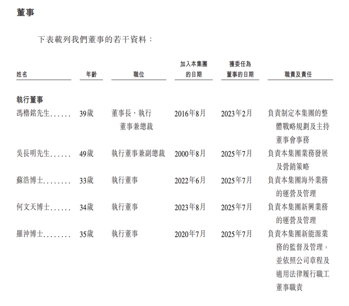 资料显示,冯橹铭,39岁,公司董事长、执行董事兼总裁。冯橹铭于2016年8月加入集团担任董事,并于2023年2月重新加入集团,担任董事兼公司总裁,并于2025年7月获委任为董事长。冯橹铭于2026年1月调任为执行董事且其主要负责制定集团的整体战略规划及主持董事会事务。