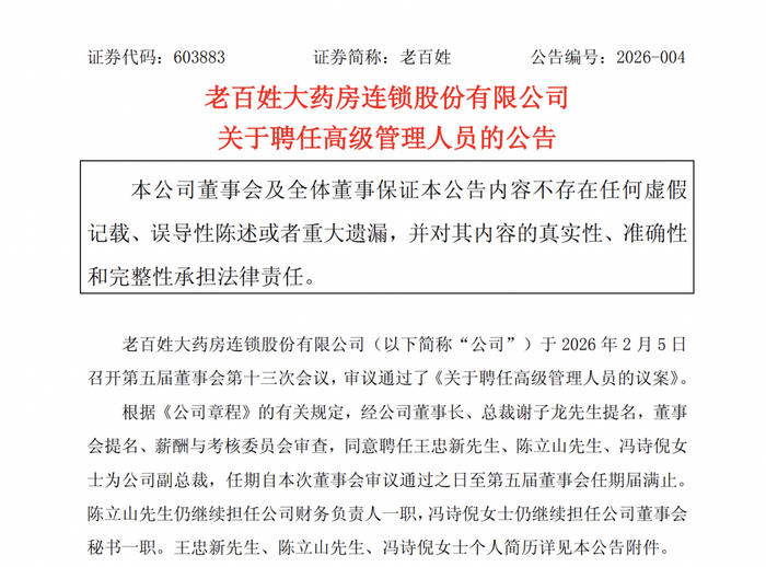 瑞财经 刘治颖 2月5日,老百姓(SH603883)公告,经公司董事长、总裁谢子龙先生提名,董事会提名、薪酬与考核委员会审查,同意聘任王忠新、陈立山、冯诗倪为公司副总裁,任期自本次董事会审议通过之日至第五届董事会任期届满止。陈立山仍继续担任公司财务负责人一职,冯诗倪仍继续担任公司董事会秘书一职。
