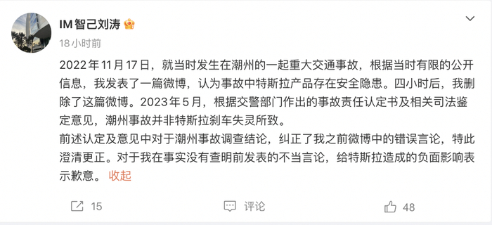 刘涛称:“前述认定及意见中对于潮州事故调查结论,纠正了我之前微博中的错误言论,特此澄清更正。对于我在事实没有查明前发表的不当言论,给特斯拉造成的负面影响表示歉意。”