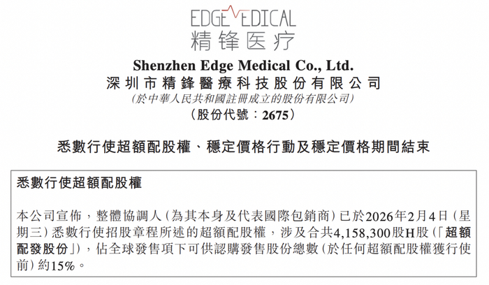 瑞财经 刘治颖 2月4日,精锋医疗-B(02675)公告,整体协调人悉数行使15%超额配股权,涉及合共415.83万股H股。