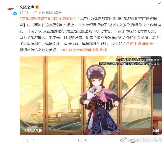 说到原神的文化传播,相信大部分玩家第一时间想到的就是璃月港的种种:中国风的建筑、张家界和黄龙的地貌参考以及璃月角色身上蕴藏的中华底蕴。文旅部的微博“文旅之声”在原神的获奖微博上放了一段视频,开头也是对《神女劈观》、逐月节和海灯节对中国传统节日的形象传播等标志性的文化内容均进行了评价,并给出“原神致力于让全球玩家都能领略中华文化的魅力”的认可与赞扬。
