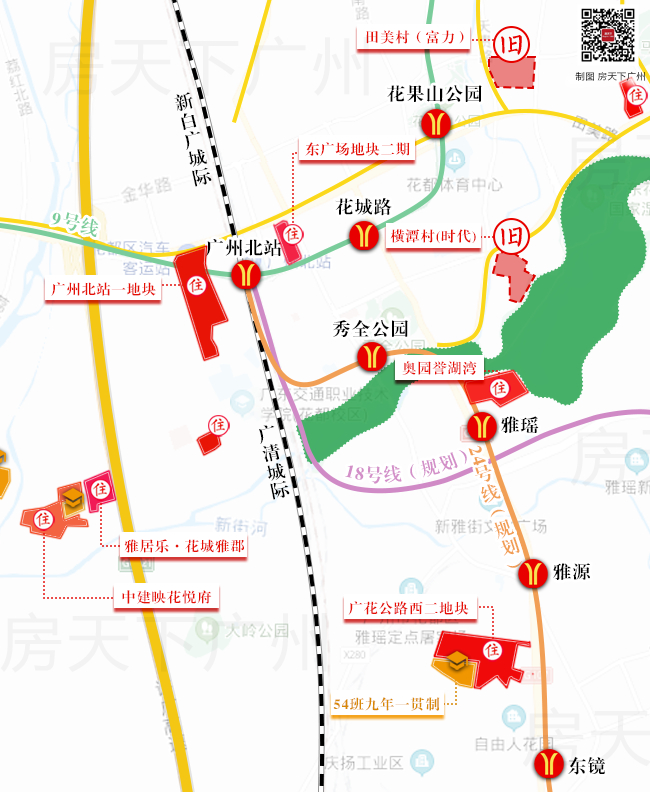 目前离北站较近的新盘包括中建·映花悦府以及雅居乐·花城雅郡。
