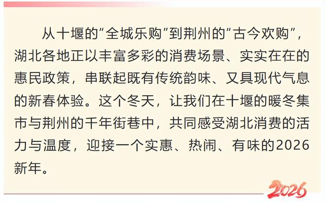 随着2026年新年脚步临近,湖北省商务厅组织湖北跨年国际消费嘉年华活动持续升温。十堰、荆州等地围绕商圈促销、县域特色、惠民补贴、文旅融合等多个维度,推出一系列精彩纷呈的活动,共同点燃荆楚大地消费热情。