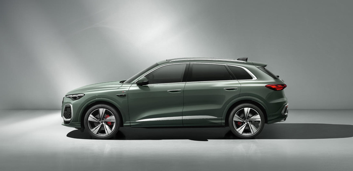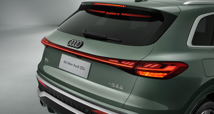 侧面来看,新车侧面造型同样十分动感,笔直的腰线从侧翼子板贯穿至车尾看上去更加硬朗。此外,全新奥迪Q5L在车顶行李架、车窗周围均采用熏黑处理,时尚感较强。车尾部分,新车采用了贯穿式尾灯组造型,内部运用的全新设计的样式,高位刹车灯下方的quattro字母,点亮后辨识度得到进一步提升。