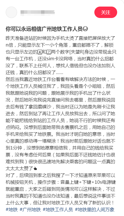 谢谢小姐姐对工作人员服务的肯定。手机故障又没带现金真的会很无助,看到表扬我们心里暖暖的!这也是我们最想传递的温暖。偷偷告诉您,这位“小太阳”员工已经被奖励小红花。如日常在车站需要工作人员协助,请大胆招手哦,每一份信任都是我们前进的光。