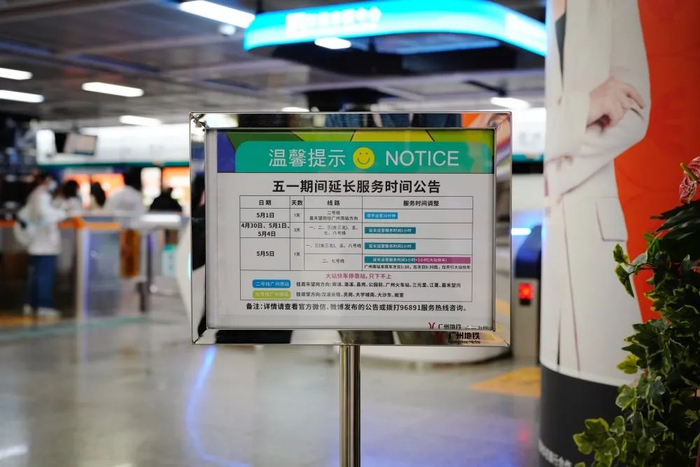 伴随假期接近尾声,为方便广州南站返穗市民夜间出行,5月5日,一、三(含三北)、五、八号线延长运营服务1小时;连接广州南客运枢纽的二、七号线则延长运营服务2小时,期间延长的第一个小时站站停,延长的第二个小时(即次日0:30-1:30)将开行广州南站单向大站快车,中途只下不上。二号线广州南站往嘉禾望岗方向大站快车沿途只停靠南浦、洛溪、昌岗、公园前、广州火车站、三元里、江夏、嘉禾望岗;七号线广州南站往姬堂方向大站快车沿途只停靠汉溪长隆、员岗、大学城南、大沙东、姬堂。