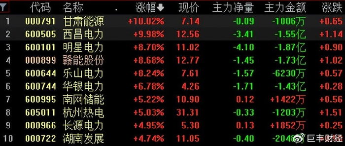 周一,电力板块表现强势,甘肃能源、西昌电力涨停,明星电力、赣能股份、乐山电力、华银电力、南网储能、杭州热电等多股跟涨。
