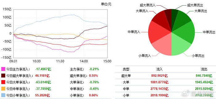 根据东财统计,截止收盘沪深两市呈现资金净流出状态,当日沪深两市资金当日沪深两市资金共流出17.50亿元。其中,超大单净流入46.12亿元,大单净流出63.61亿,中单净流出37.79亿元,小单净流入55.28亿元。