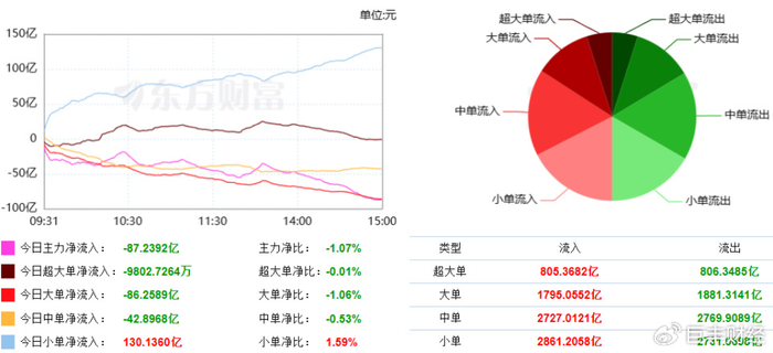 根据东财统计,截止收盘沪深两市呈现资金净流出状态,当日沪深两市资金当日沪深两市资金共流出87.24亿元。其中,超大单净流出0.98亿元,大单净流出86.26亿,中单净流出42.90亿元,小单净流入130.14亿元。
