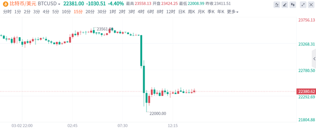受累于加密货币友好银行Silvergate的财务危机持续发酵,比特币于周五亚盘突然跳水,短短1个小时内从23500美元大跌超5%,最低至22000美元,触及两周来低点,市值瞬间蒸发220亿美元。