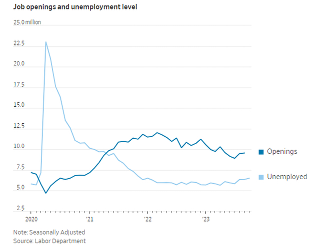 自2022年3月创下历史新高以来,这两大数据的差距一直呈下降趋势。美国劳工部的数据显示,商业服务、信息和制造业的空缺职位数量在过去一年都有所下降。