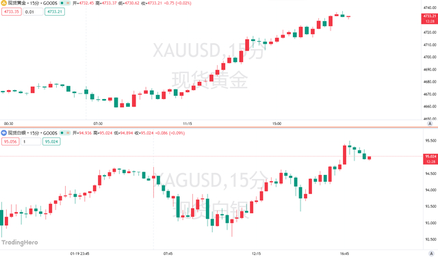 随着美国总统特朗普推动接管格陵兰岛引发了对美欧爆发潜在贸易战的担忧,周二,金价将历史新高刷新至4700美元上方,并冲上4730美元,银价也持续创下历史新高,并冲上95美元上方。