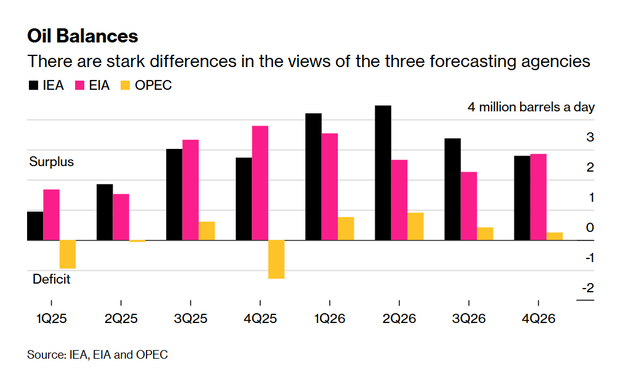 全球三大主流能源预测机构——国际能源署(IEA)、美国能源信息署(EIA)与OPEC均已更新2026年预测,三者间的分歧依旧显著,形成了两大消费端机构与产油国阵营的对立研判格局。