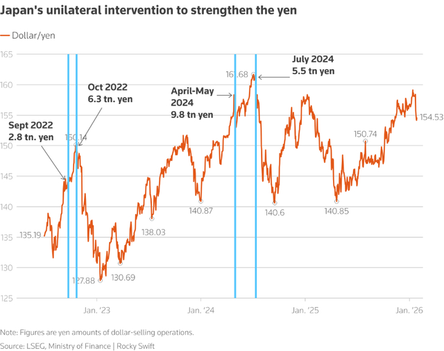 美日协同干预汇市的预期暂时支撑日元汇率,但历史经验显示实际干预效果有限,叠加高市早苗为大选扩大刺激,干预的作用或更加大打折扣。