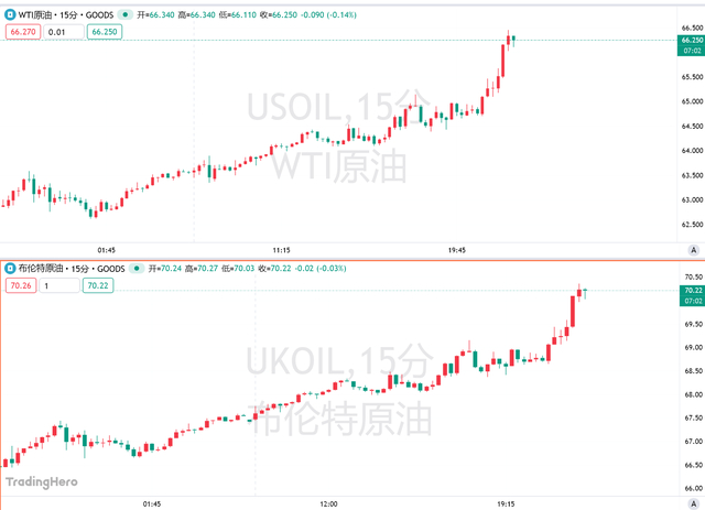 由于美国总统特朗普正考虑对欧佩克成员国伊朗实施军事打击,国际原油价格周四大涨,美、布两油日内涨幅扩大至4%以上,布伦特原油站上70美元/桶,WTI原油站上66美元/桶,均为去年9月以来首次。最新消息称,伊朗发出警告,宣布计划于周日和下周一在霍尔木兹海峡举行实弹海军演习。