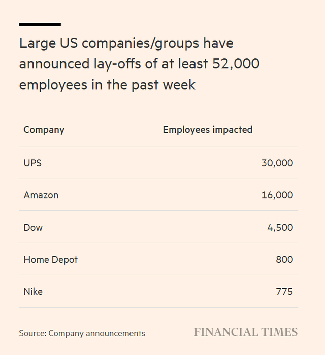 亚马逊(Amazon)、联合包裹服务公司(UPS)、陶氏化学(Dow)、耐克(Nike)、家得宝(Home Depot)等企业表示,合计将裁员逾5.2万人,其中数家企业称,受经济不确定性持续影响,且人工智能领域的投资压力不断加大,公司需要精简组织架构。