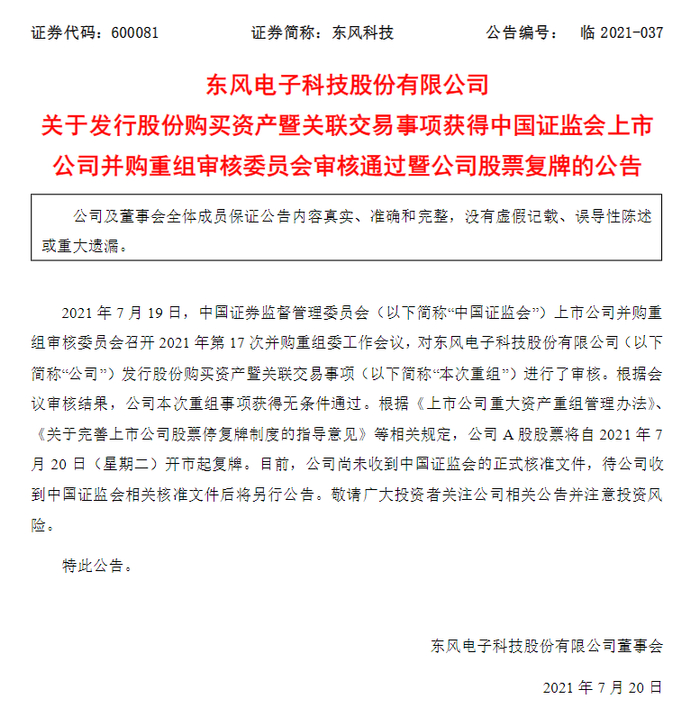 7月20日,东风电子科技股份有限公司(以下简称“东风科技”)发布重大资产重组项目通过证监会审核暨公司股票复牌的公告。根据公告,7月19日,在中国证券监督管理委员会上市公司并购重组审核委员会召开的2021年第17次并购重组委工作会议上,东风科技重大资产重组项目获得无条件通过。