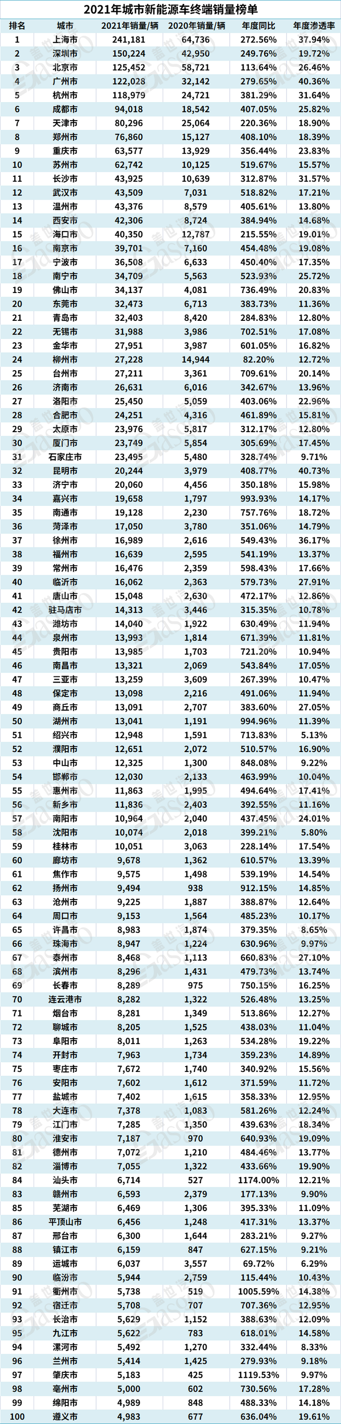 盖世汽车根据2021年城市新能源车终端销量,整理出年度销量榜单TOP100,涵盖城市对应2021年销量、2020年销量、全年累计城市销量同比增长情况