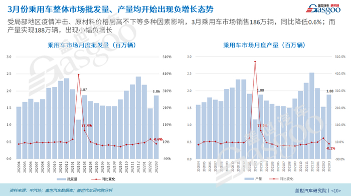 从国内乘用车一季度的表现来看,3月份国内乘用车整体市场并未延续1月、2月的市场平稳增长,批发量、产量分别完成186万辆、188万辆,均开始出现小幅负增长。但是2022年Q1新能源汽车保持超高速增长,3月份乘用车市场渗透率已经接近25%的水平。