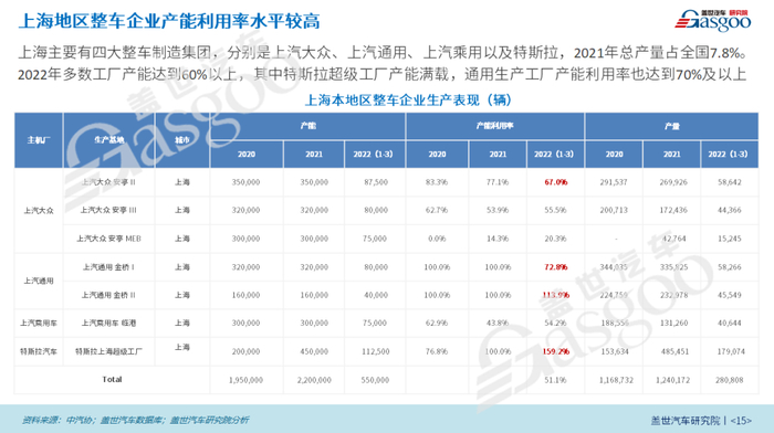 上海地区拥有上汽大众、上汽通用、上汽乘用以及特斯拉四大整车制造集团,2021年整体产能规模在220万辆左右,且多数工厂2022年第一季度产能都达到60%以上。