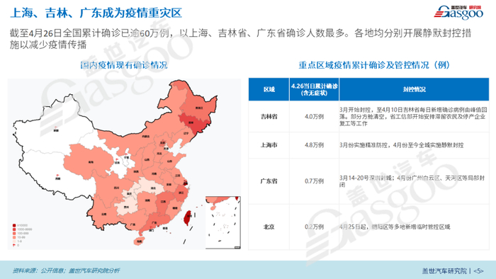 ▶ 奥密克戎疫情多地爆发,截止4月26日全国累计确诊已逾60万例,以上海、吉林省、广东省确诊人数最多,成为疫情冲击影响最大的区域。
