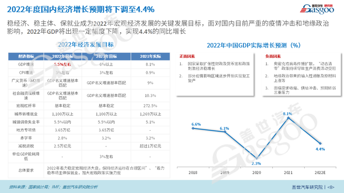 ▶ 2022年国家定调GDP增速保持在5.5%的稳增长发展目标,但是受奥密克戎病毒传播扩散和“动态清零”政策的管制,国内生产消费活动受阻,以及地缘政治带来的输入性通胀及原材料上涨等影响,我们认为当前国内经济面临需求收缩、供给冲击、预期转弱三重压力,预计2022年GDP将出现一定幅度下降,有望实现4.4%的同比增长。