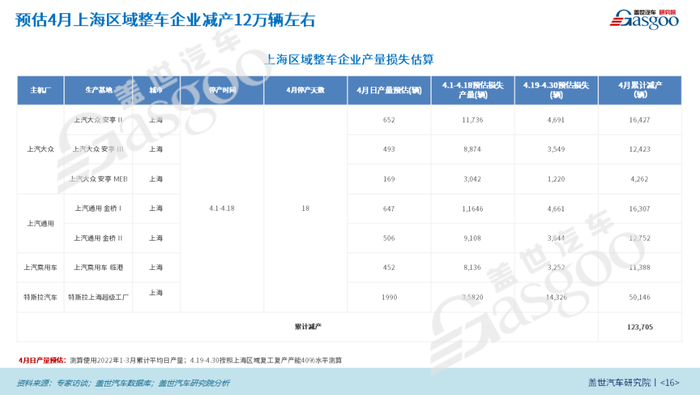 结合当前疫情管控下,车企停工停产时间和复工复产状况,我们评估4月上海区域整车企业将减产12万辆左右。其中,上汽大众上海区域工厂产量预计损失超过3.2万辆;上汽通用上海区域工厂产量预计损失超过2.9万辆;上汽乘用车上海区域工厂产量预计损失超过1.1万辆,而特斯拉上海区域工厂整个4月产量损失将超过5万辆。