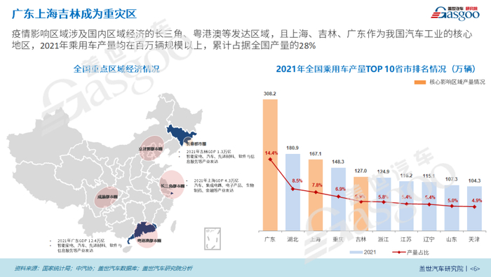 从区域经济来看,国内疫情波及长三角、粤港澳等两大都市群经济群。其中,2021年上海GDP达到 4.3万亿,汽车、集成电路、电子产品、生物制药、金融等产业国内领先;2021年广东GDP 12.4万亿,智能家电、汽车、先进材料、软件与信息服务等产业发达。同时从汽车产业看,上海、吉林、广东作为我国汽车工业产业聚集核心区域,2021年三个地区乘用车产量占据全国产量的28%。因此此次疫情的影响不管是整体区域经济还是汽车产业都有沉重的冲击。