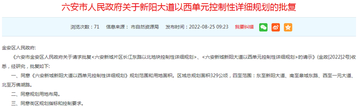 近日,市自然资源局六安市人民政府关于新阳大道以西单元控制性详细规划的批复。
