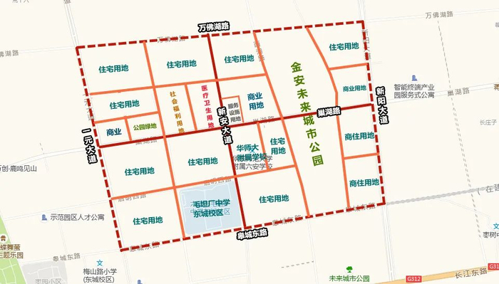 区域总规划面积329公顷,四至范围:东至新阳大道、南至皋城东路、西至一元大道、北至万佛湖路。