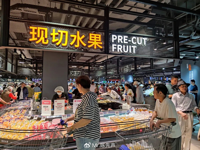 同时,服务细节全面升级。海鲜区提供活鱼切片、打氧保鲜服务,肉禽区提供切丝、剔骨、绞肉等服务;食品货架悬挂放大镜,连卷袋旁配置湿手器,食品安全方面,严格践行“468鲜度法则”,果切超4小时八折、6小时六折、8小时下架,让市民朋友买得放心,吃得安心。