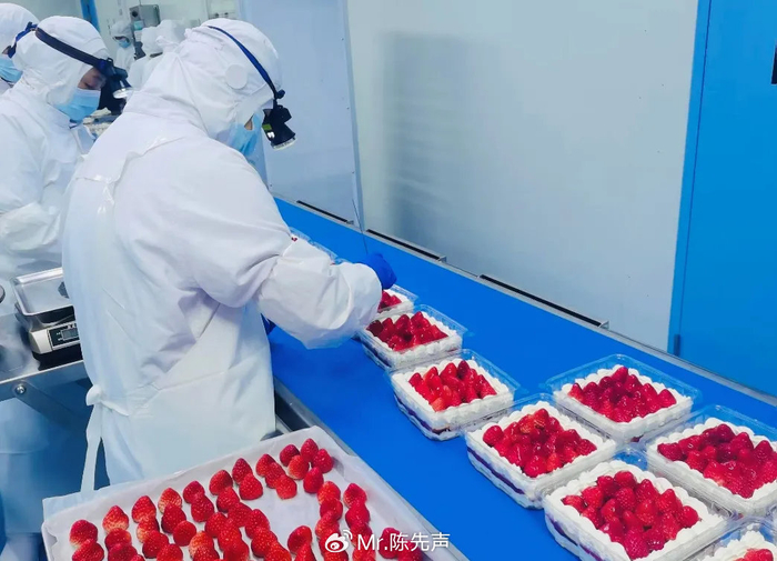 第二关:大仓复试。冷链车到达区域大仓后,质检员对草莓进行第二次体检,检查运输过程中是否有压伤、温度波动导致的变质草莓。