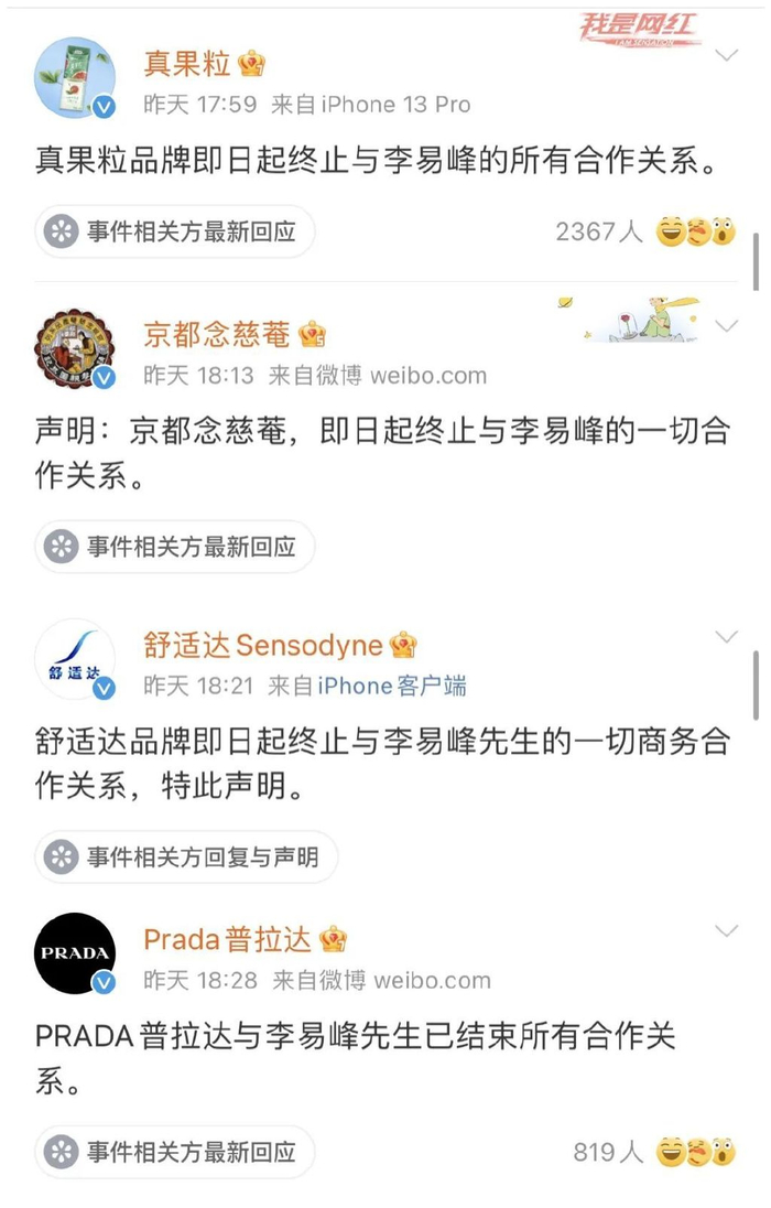 事件发生后,品牌商家迅速与李易峰解除合作关系。