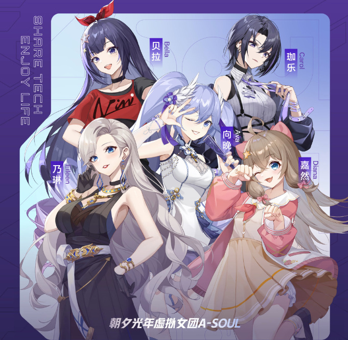 从两年前开始,乐华娱乐布局虚拟偶像。首个女团A-SOUL以积极向上的人设出道,由向晚(Ava)、贝拉(Bella)、珈乐(Carol)、嘉然(Diana)、乃琳(Eileen)五人组成,发行过单曲,也做过线上直播。