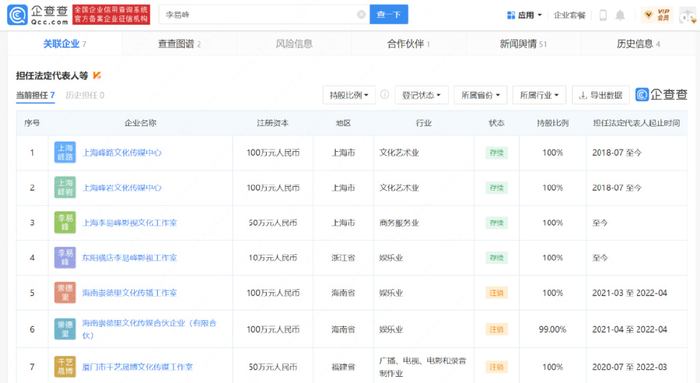 据企查查,与李易峰相关联的企业有7家,其中4家为存续状态,包括上海峰岩文化传媒中心、上海峰路文化传媒中心、上海李易峰影视文化工作室、东阳横店李易峰影视工作室,都是由李易峰个人独资。