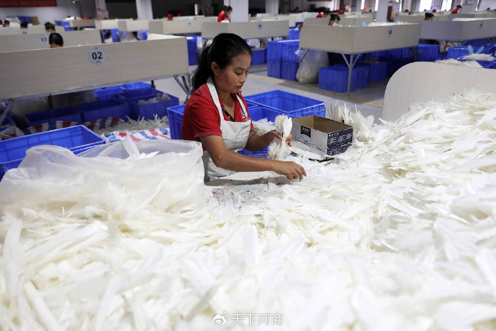 比商明亮更加忙碌的是工厂的机器,24小时满负荷运转。从羽毛片到成品羽毛球,生产过程需要经过洗毛、晒毛、排毛、插头、烘干、滴胶等38道工序,流程复杂且繁琐。为了跟上前端销售,工厂早已进入三班倒模式,人休息机器不休息。