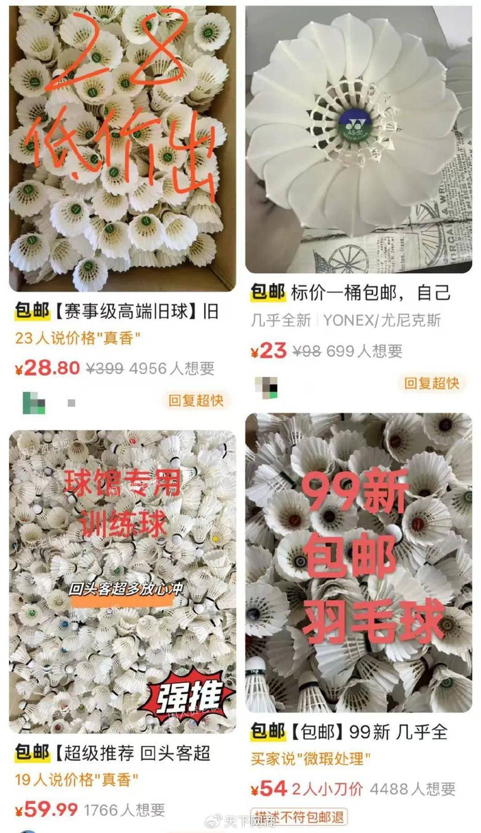 二手羽毛球也形成了一条稳定的产业链,大多是球馆回收消费者扔掉的旧球,卖给收球的商贩或店铺,回收过来的旧球经过筛选、修补、处理后再次出售,尽管会出现一些瑕疵,但不影响正常使用,优点是价格只有新球的一半或更低。