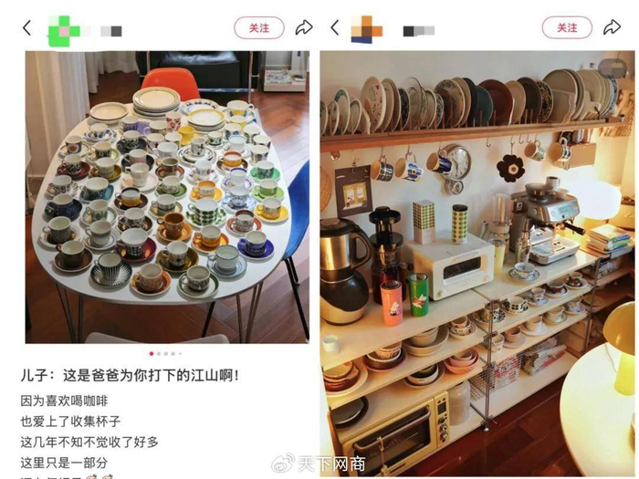 柜子里,整齐摆放着十多个款式各异的杯子。“今天喝拿铁,用这个蛋杯。底部宽,奶泡融合得好,拉花成功率最高。”如果做美式,她会换上一个透明的双层玻璃杯,可以看清色泽。旁边还放着专门的浓缩杯、猪口杯、手冲杯等,每一只都有对应的场景和购买理由,用她的话来说,“一代人有一代人的不动产”,这些咖啡杯从十几元到上千元都有,“买咖啡杯,上头”。