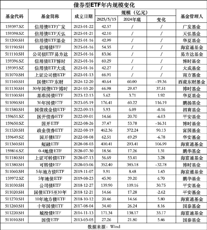 Wind数据显示,近日债券型ETF总规模首次突破2500亿元。截至5月15日,规模达到2599.01亿元,较去年底增长799.28亿元。