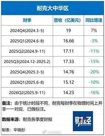 耐克还首次公布了大中华区2026年第二财季的息税前利润,为1.91亿美元,同比腰斩。