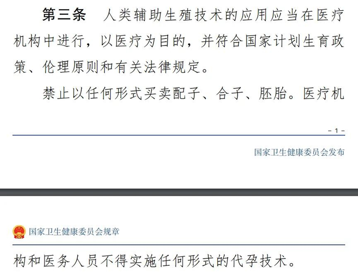 根据《人类辅助生殖技术管理办法》:“禁止以任何形式买卖配子、合子、胚胎。医疗机构和医务人员不得实施任何形式的代孕技术。”