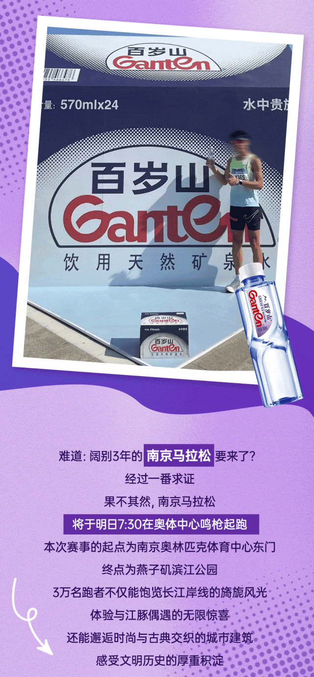 在10月29日的北京马拉松上,跑者们络绎不绝来到百岁山巨型箱子装置处打卡拍照,留下战胜自我的“标志”。明天,在南京马拉松终点,跑者们也即将见到同款打卡点,快想想怎么凹造型吧!